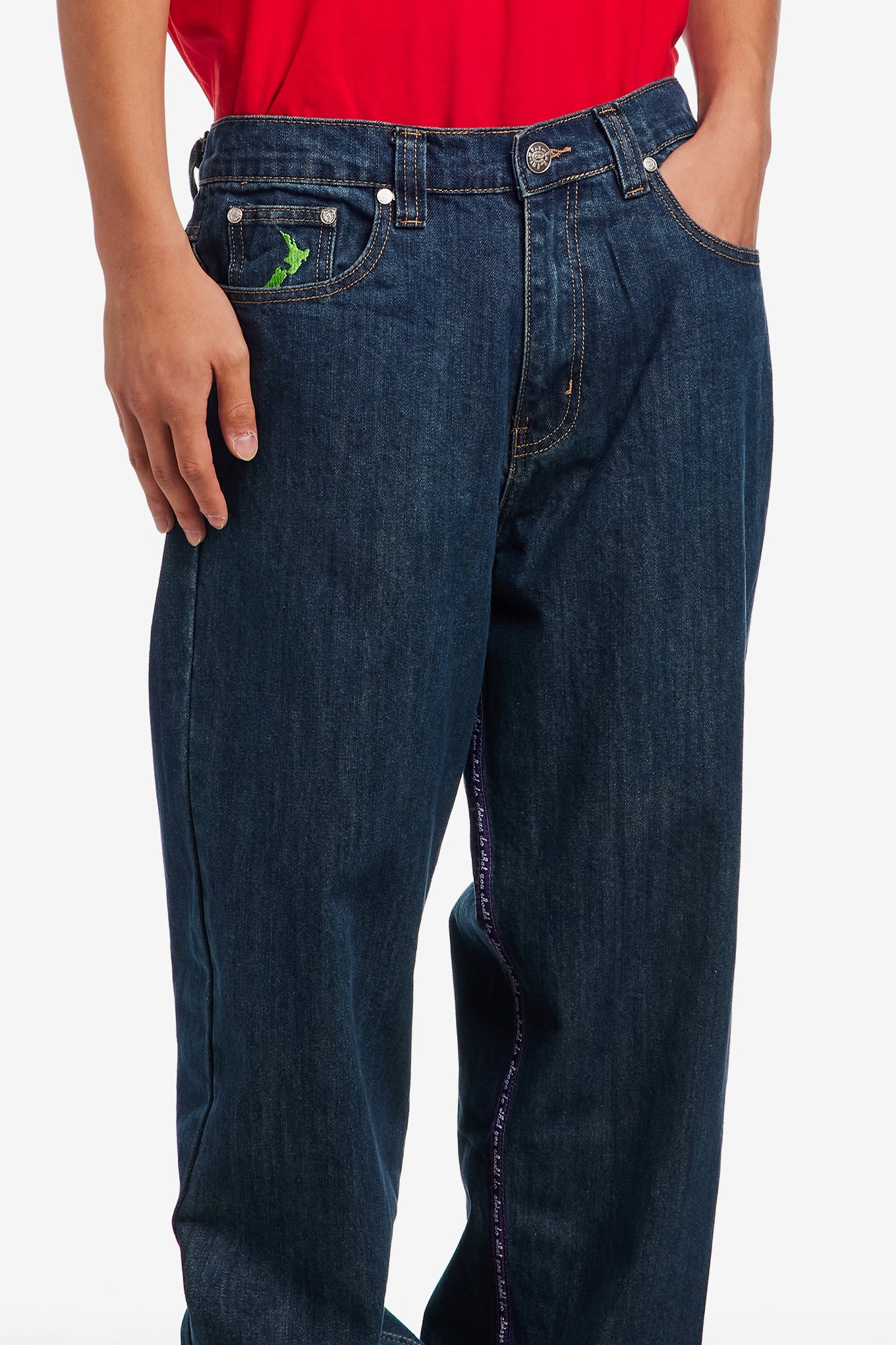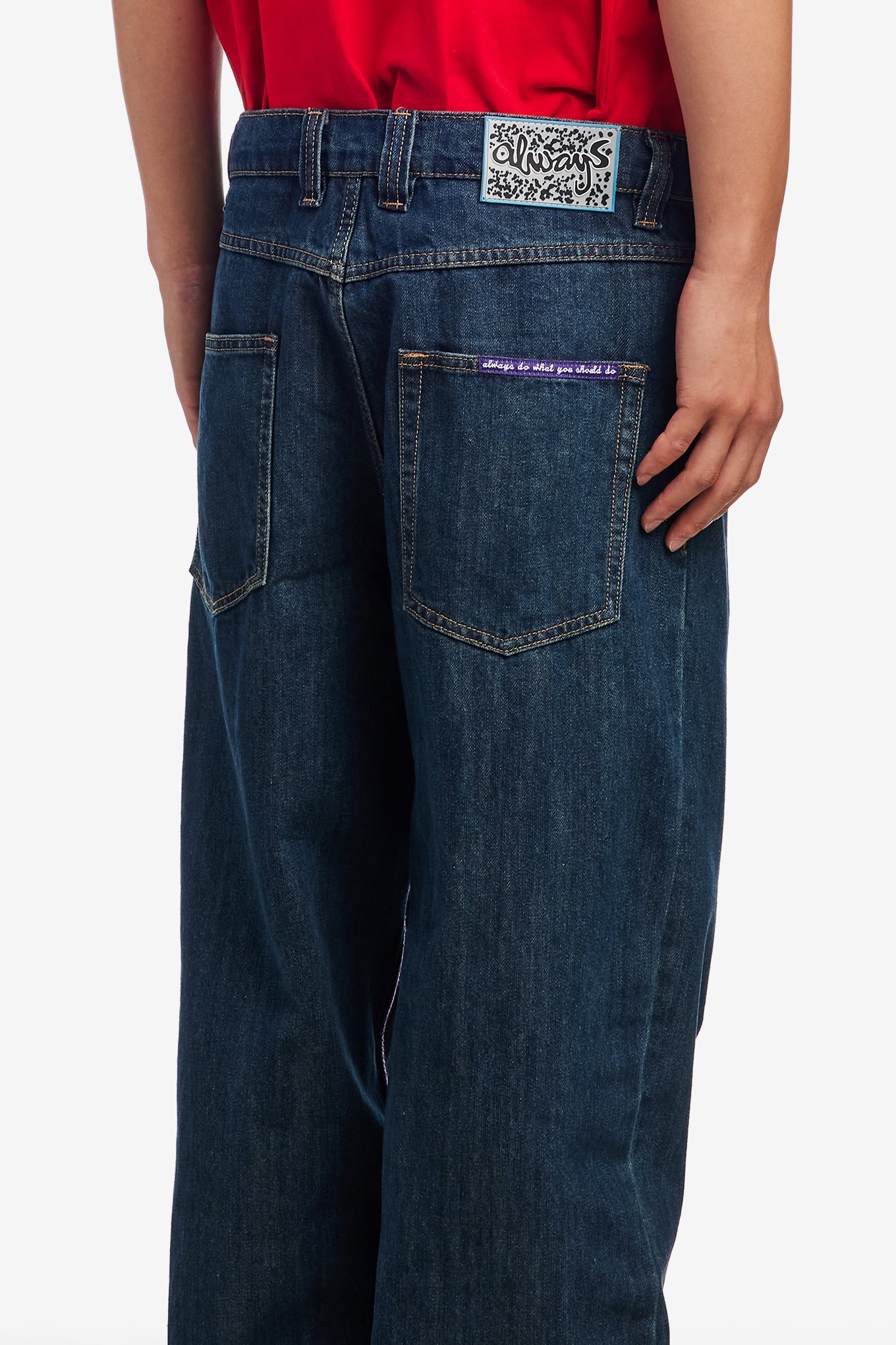 Original purple label detailing inside leg seam