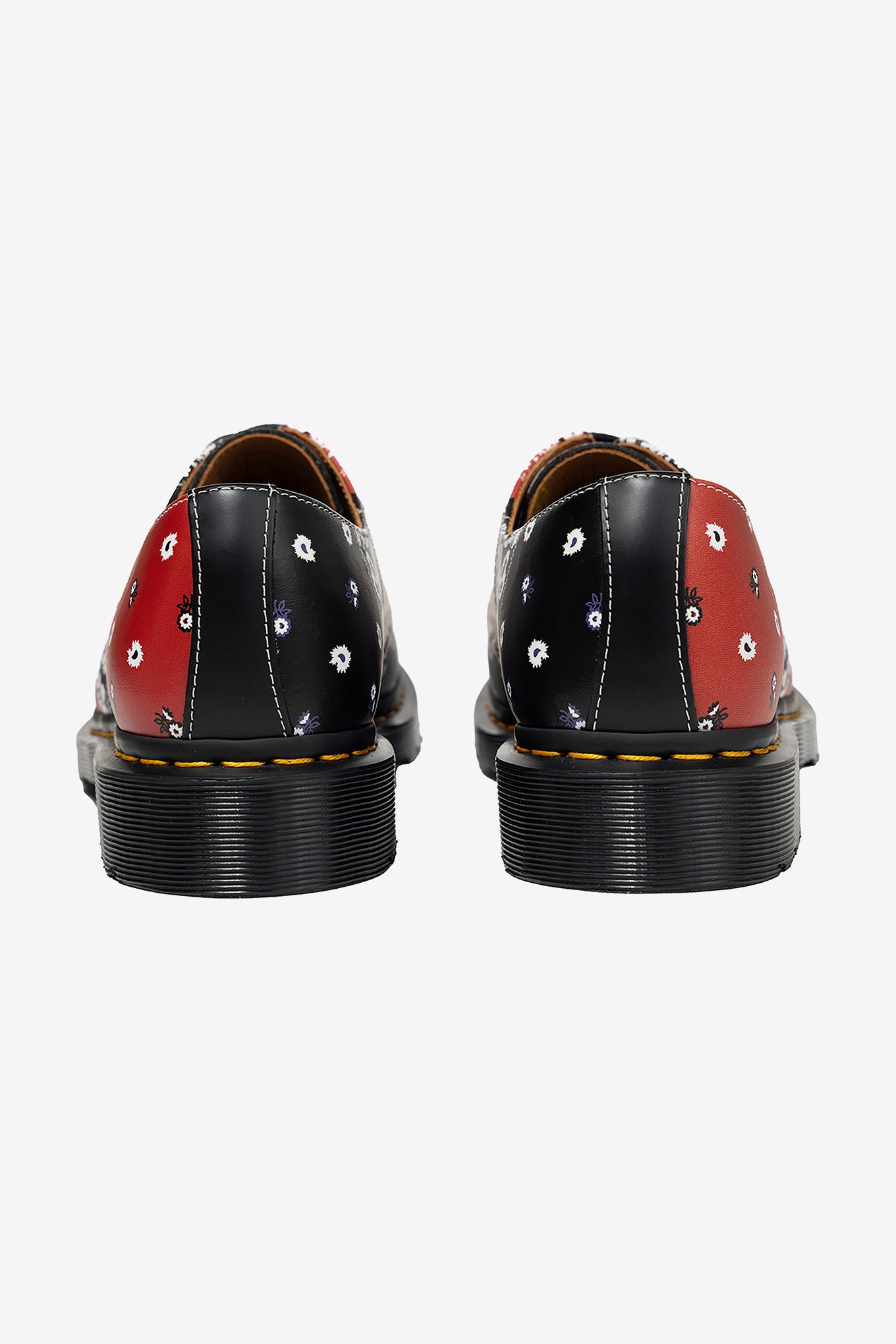 three-eye shoe features a patchwork print in red, black, blue, and white, accented with white zigzag stitching. The shoes are paired with a smoke-colored DMS outsole and finished with yellow stitching on the welt. This one-of-a-kind collection combines craftsmanship with a modern sensibility.