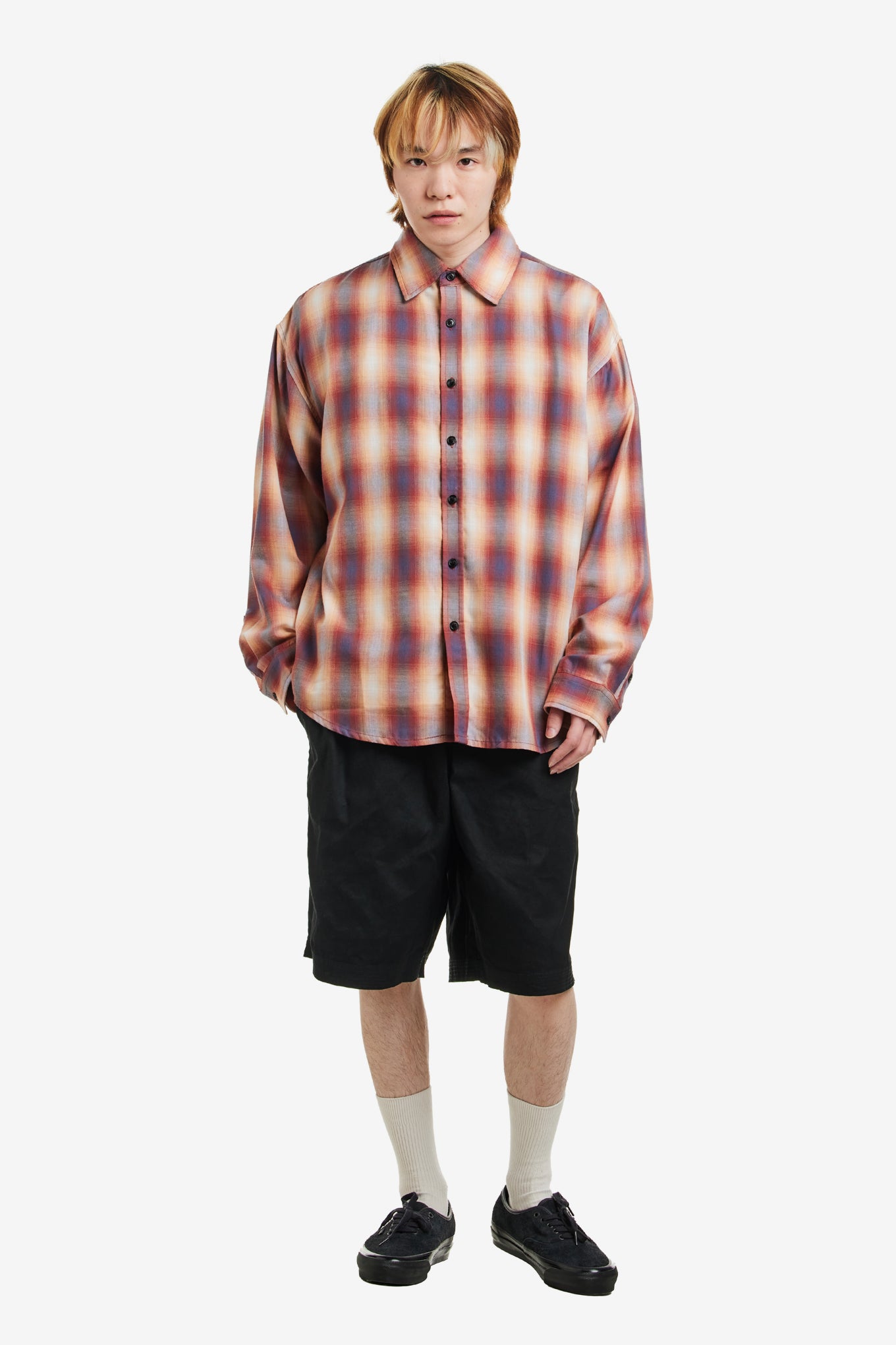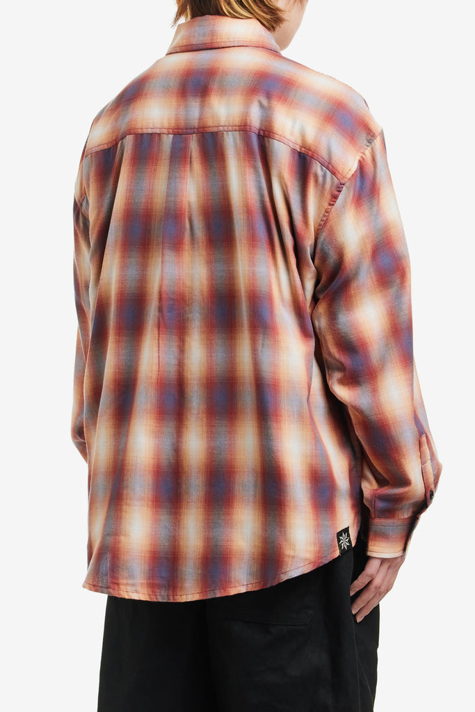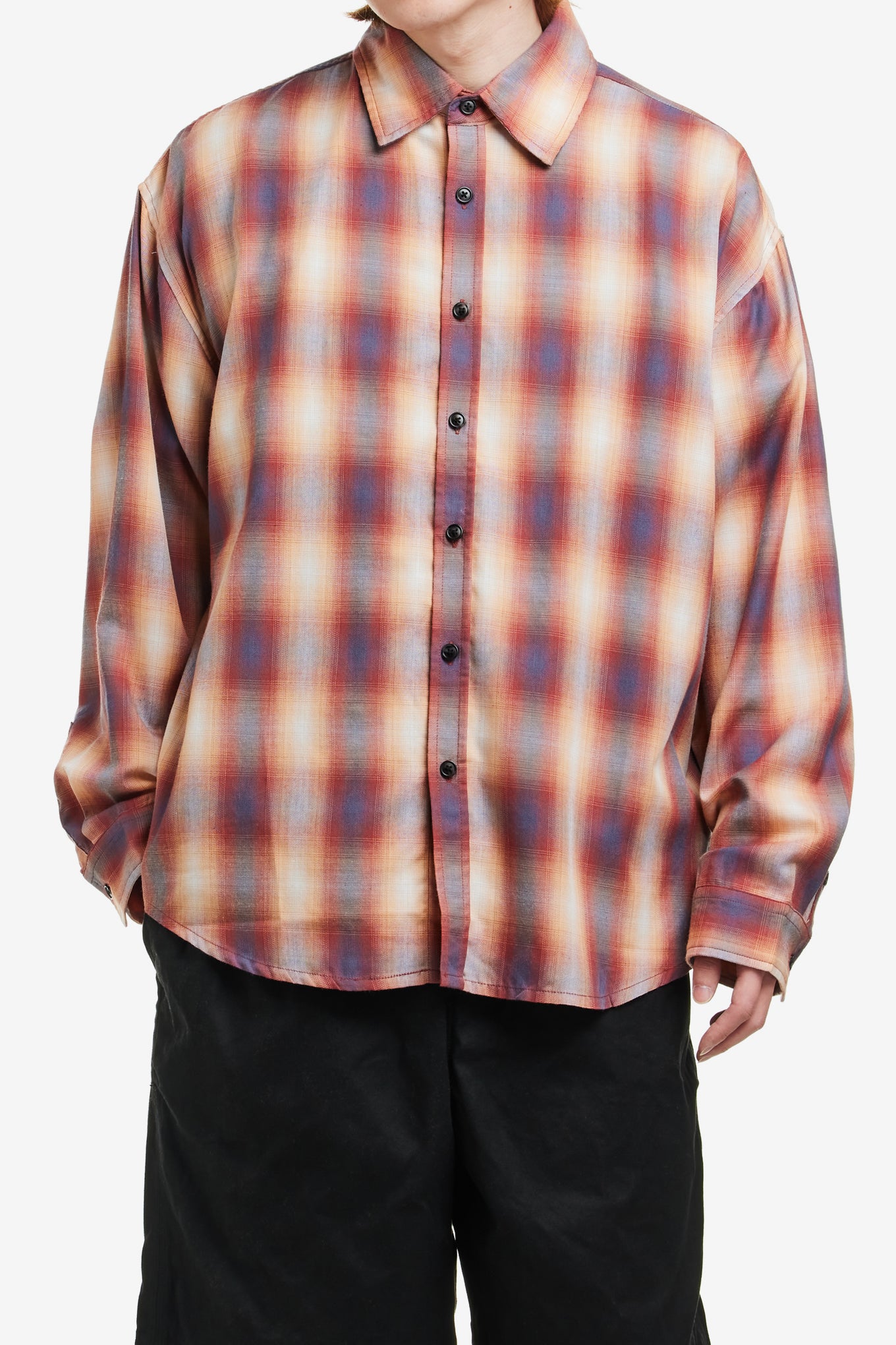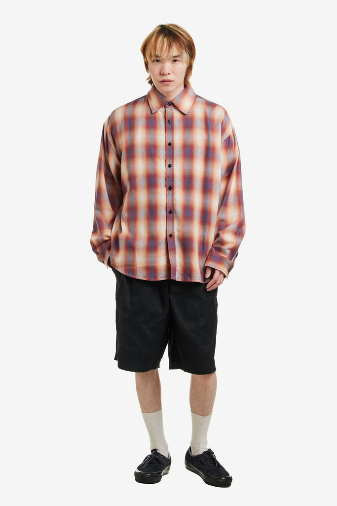 Produced in a lightweight Japanese style plaid, the men's Big LS Shirt has a relaxed, boxy fit and features a curved hem.