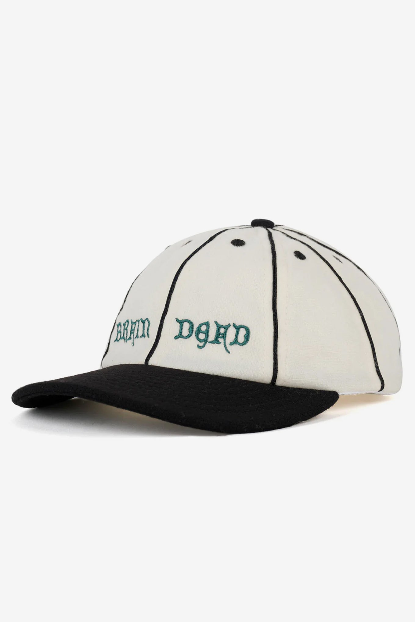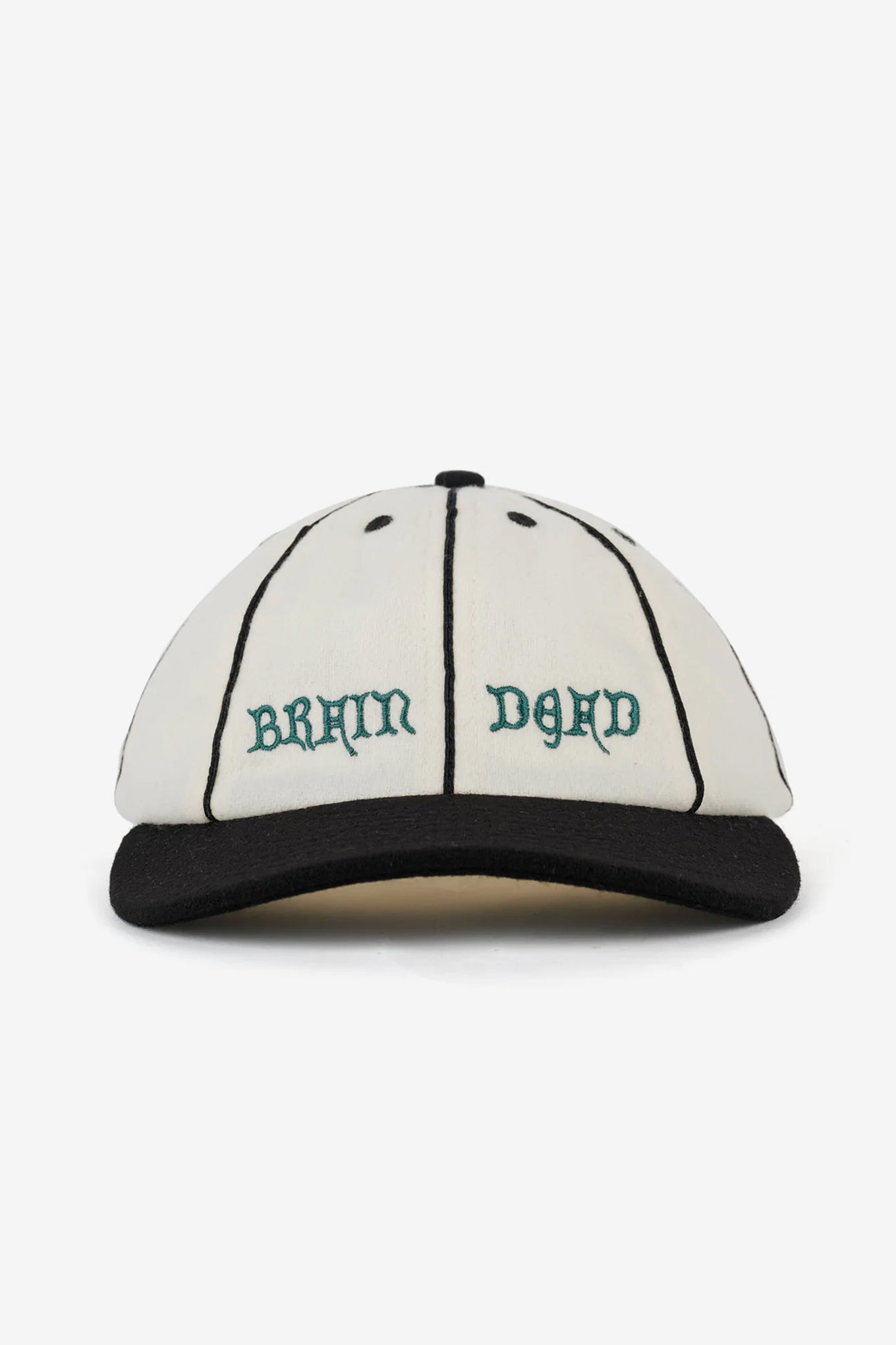 Wool flannel 8-panel strapback hat with contrasting seam piping. Brain Dead embroidery on the front.