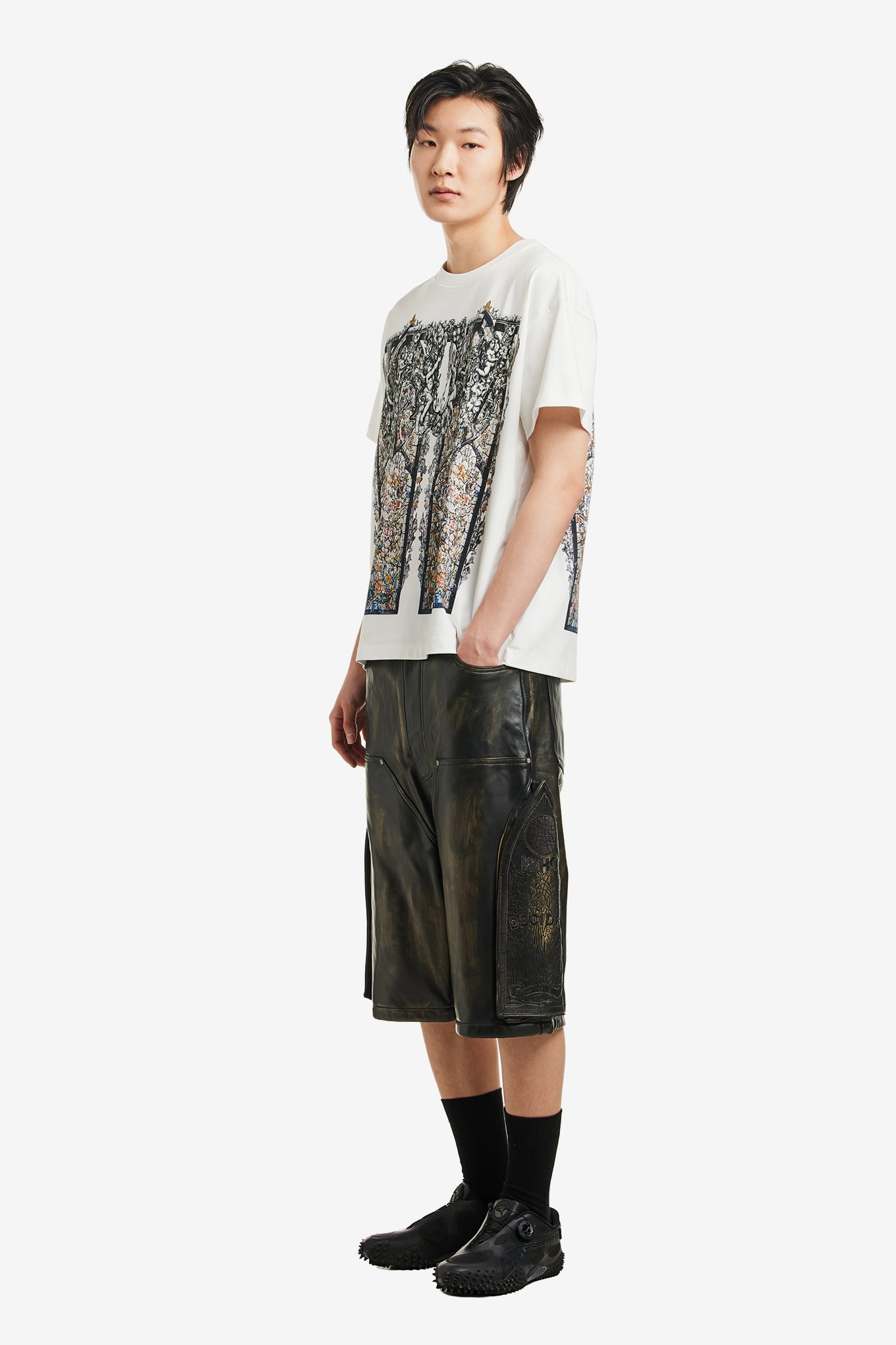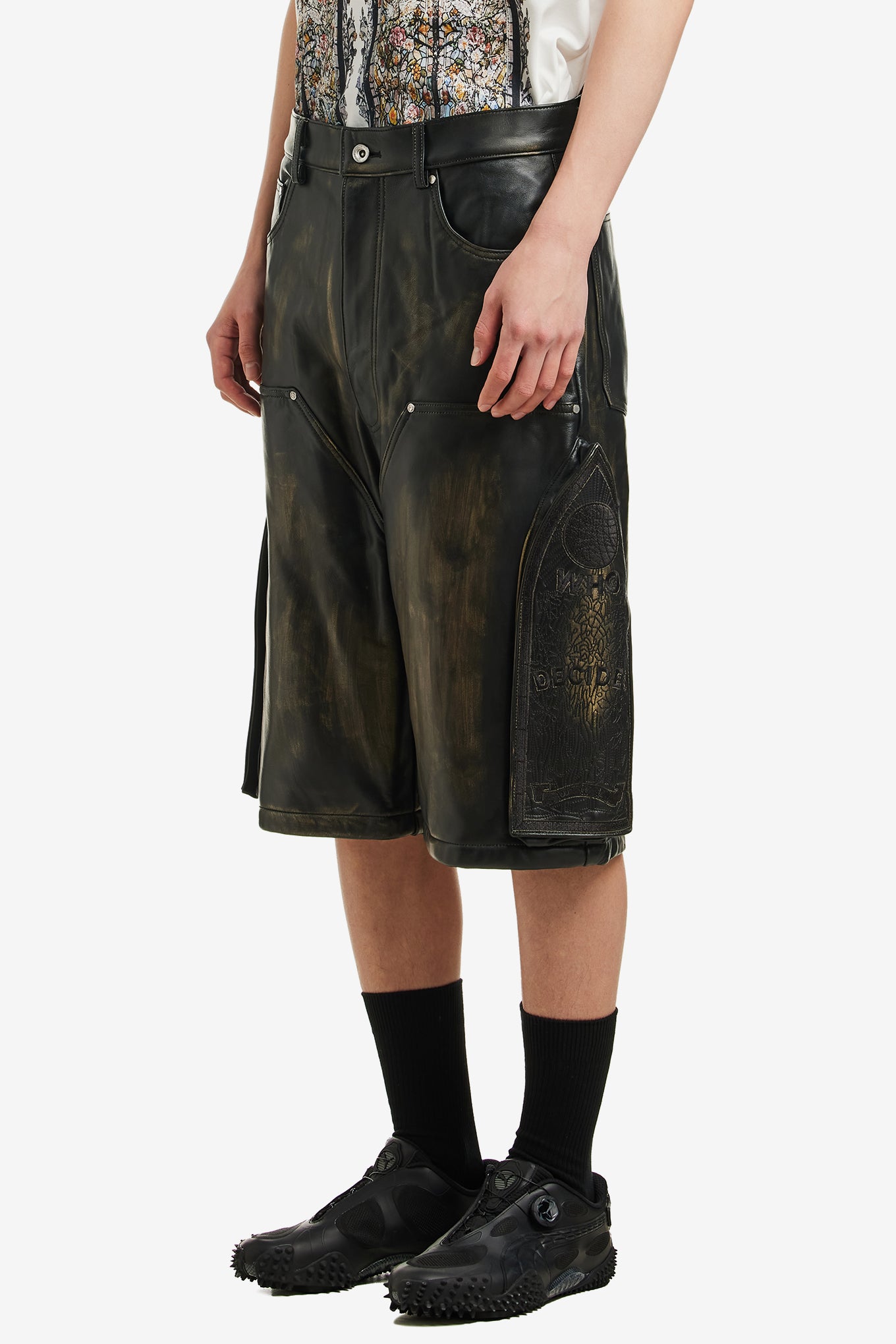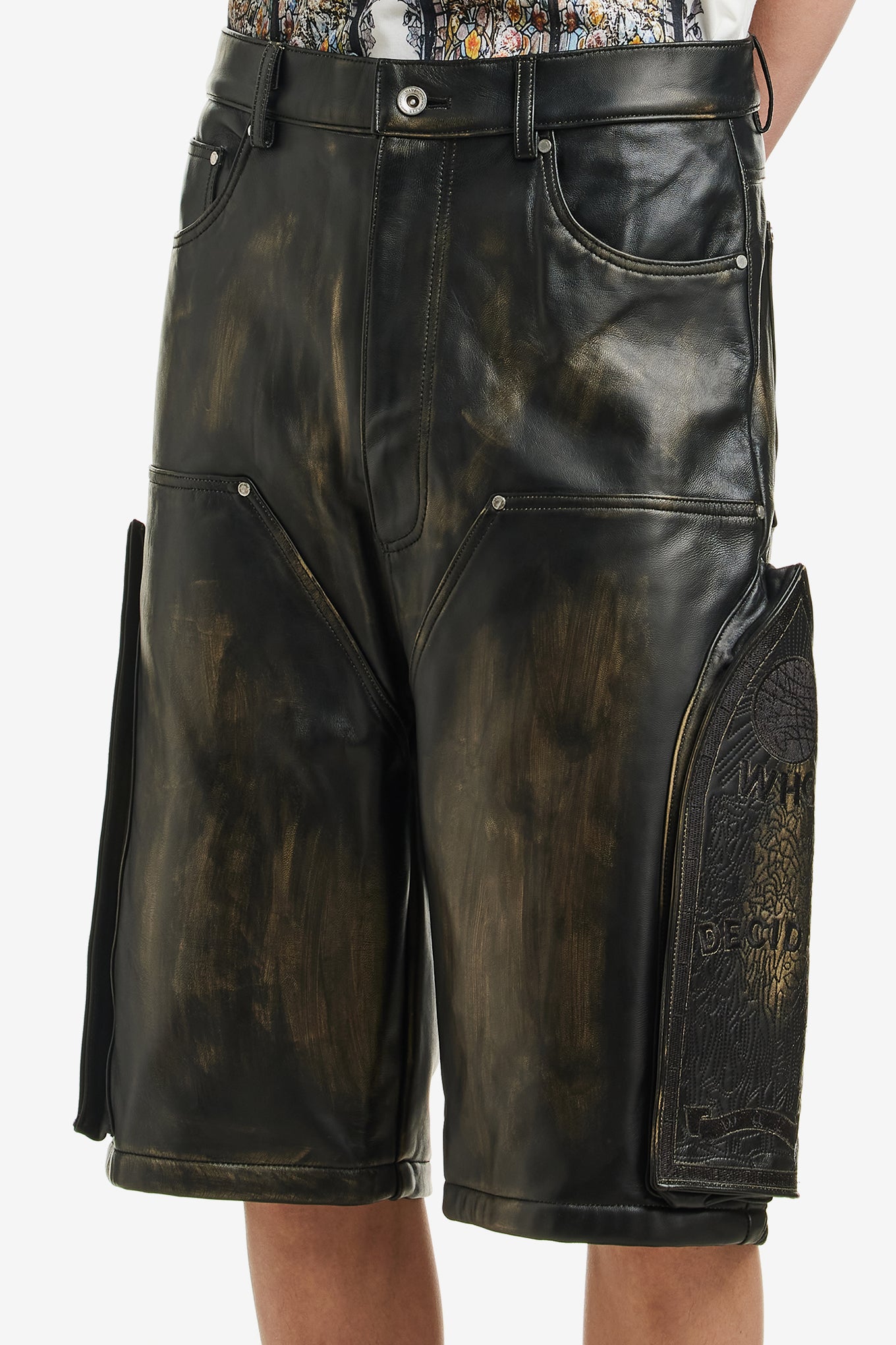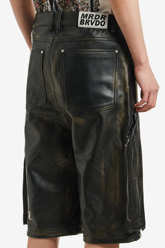 SIDE EMBROIDERY MID LENGTH LEATHER SHORT